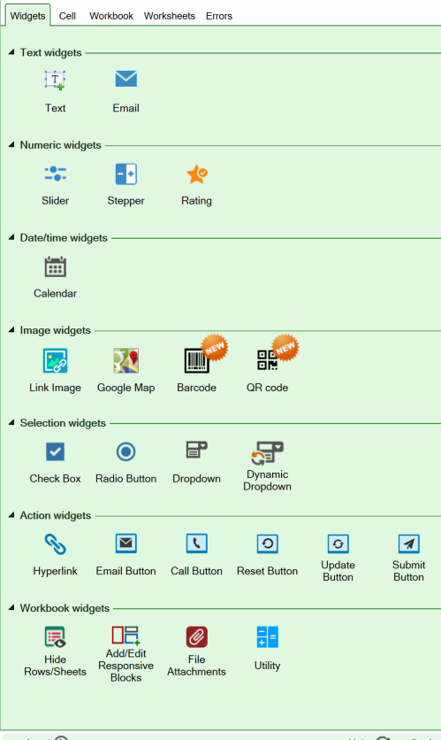 If you click on the Widgets tab you get a list of the various graphical widgets you can insert into the spreadsheet.