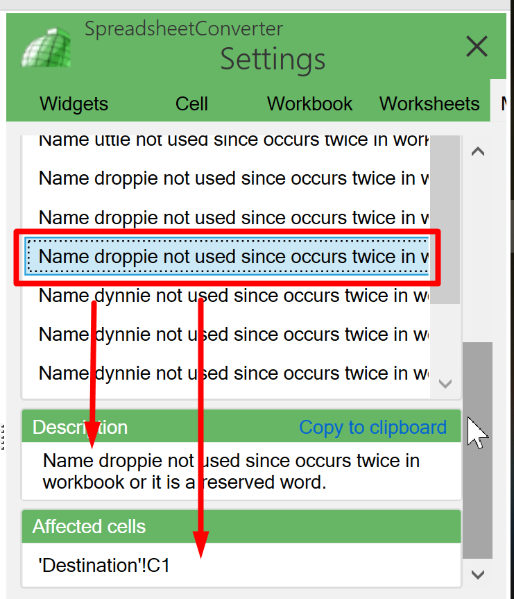 After each conversion, any error messages are available on the Messages tab of the task pane. Shorter messages in the upper section link to more detail below.