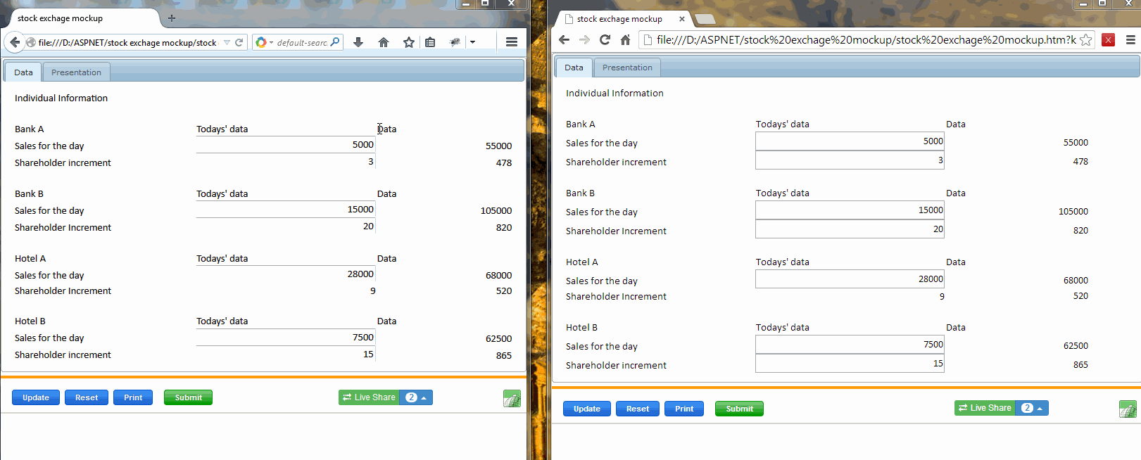 SpreadsheetConverter Real-time Sync lets you collaborate on a spreadsheet on the web. Multiple users can update the same electronic form or live calculator at the same time to make the work more efficient. In this help page, we will show you how to create a session and invite other users from a web page created with the HTML flavor of SpreadsheetConverter. There is a similar page describing Real-time Sync in the iPhone/Android flavor.
